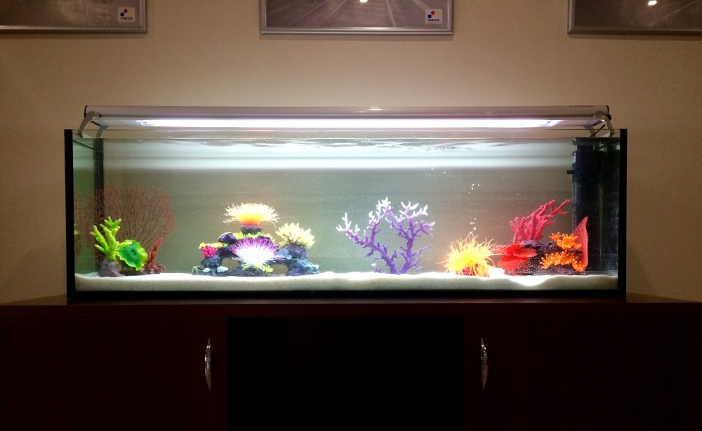 Красивый аквариум с белоснежным песком и интересными декорациями.